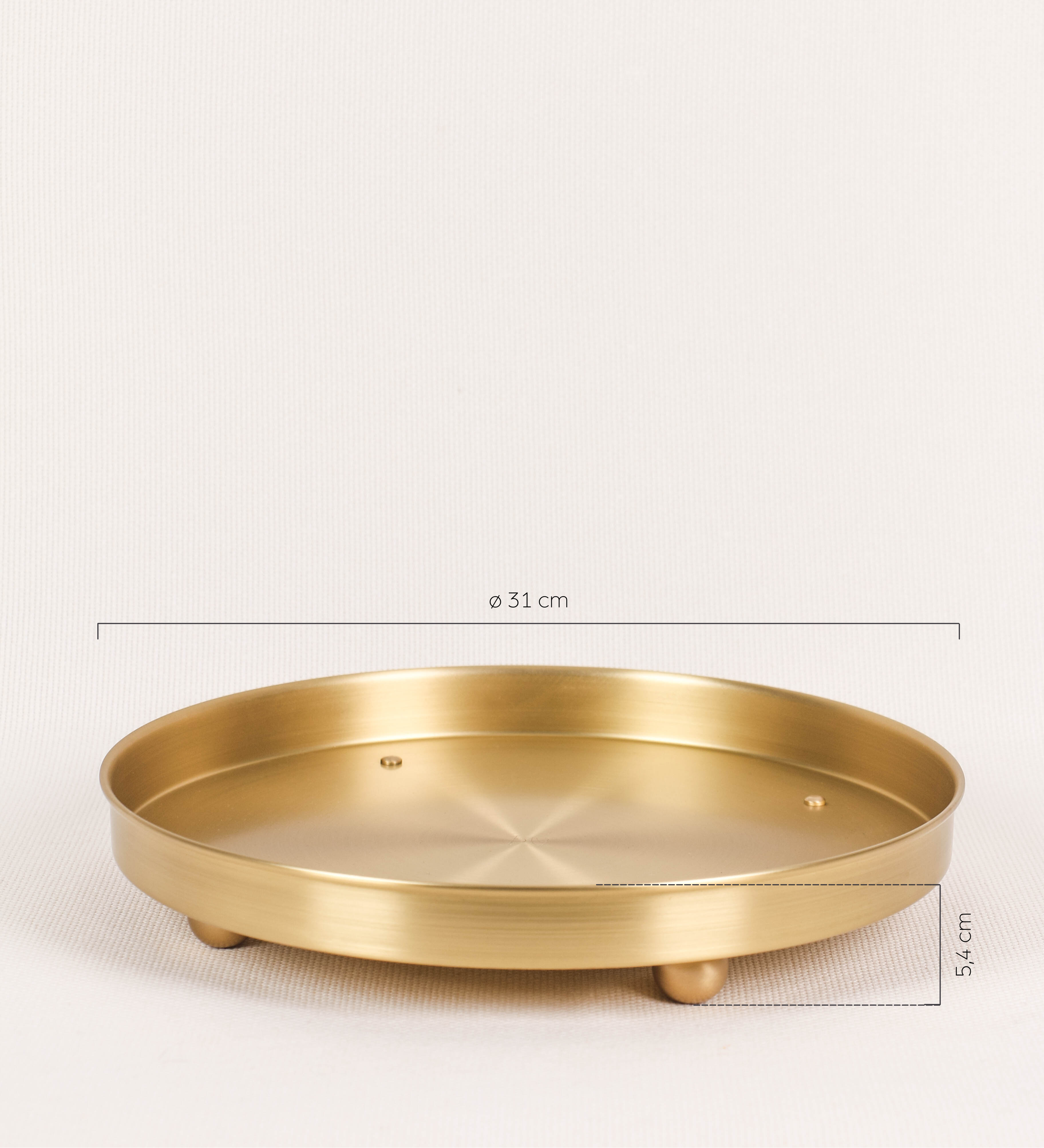 Bandeja com um design sofisticado e intemporal. A bandeja é de latão, com um tom dourado mate e acabamento escovado. Tem uma forma circular, de superfície plana e com uma borda envolvente de altura média e grossura fina. Na sua base tem três pequenas esferas, em latão também, dispostas em formato triangular, que sustentam o prato circular no topo.