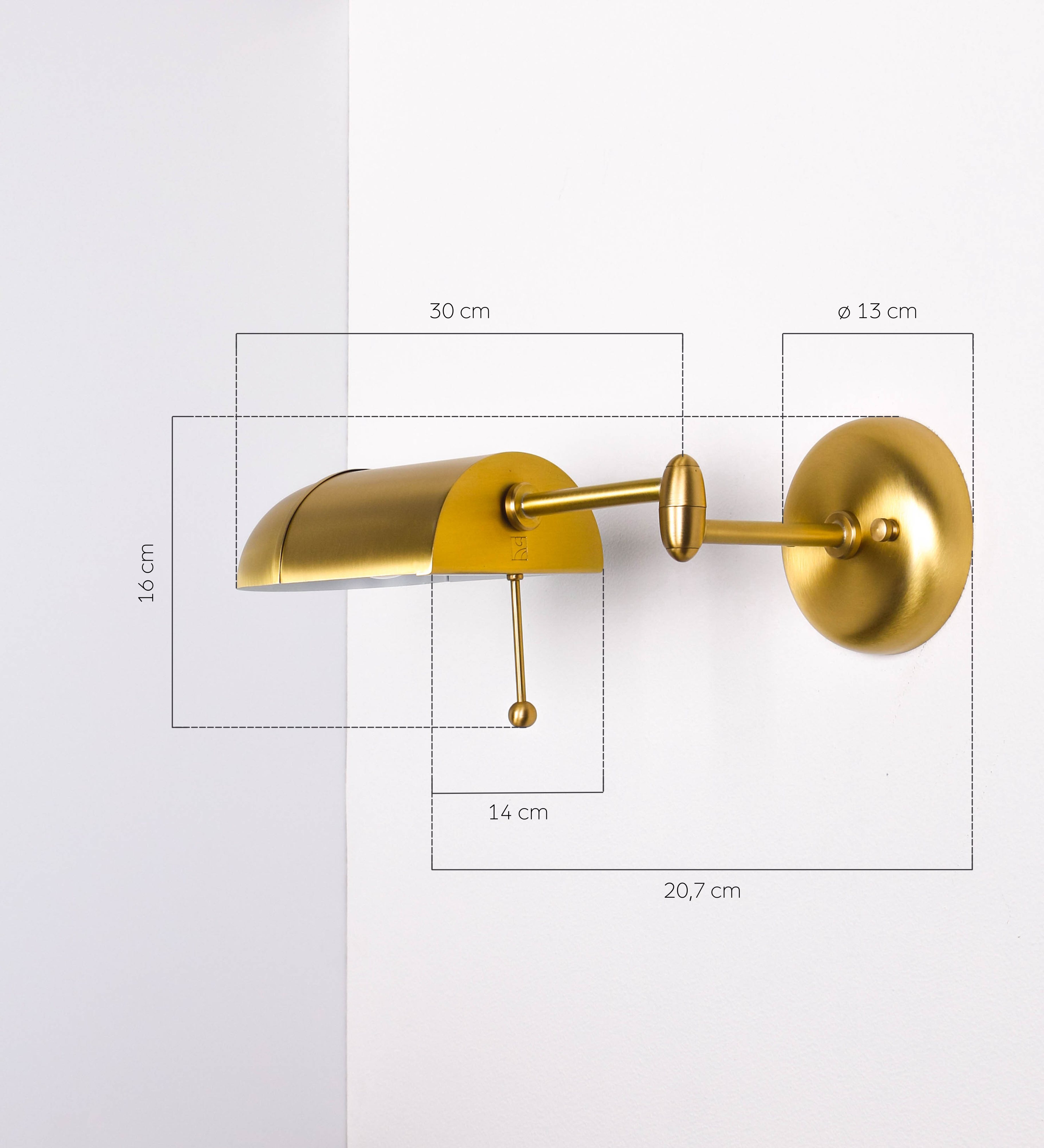 Para o guarda-livros moderno, que domina números e finanças com rigor e criatividade, esta coleção é a companhia perfeita. E se, além dos números, aprecia um bom livro, relaxe à luz de um dos nossos candeeiros, com um chá ou outra bebida, enquanto se perde nas palavras do mais célebre dos guarda-livros: Fernando Pessoa. Com dois braços articulados e um chapéu ajustável, o Aplique Guarda-Livros permite direcionar a luz exatamente onde precisa. Os acabamentos em Níquel e Latão, aliados ao interior branco, garantem uma apresentação requintada e uma difusão de luz ideal. E porque é um candeeiro de parede, mantém a sua secretária livre para os livros e papéis que não dispensa.